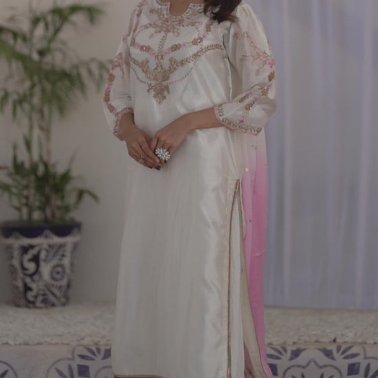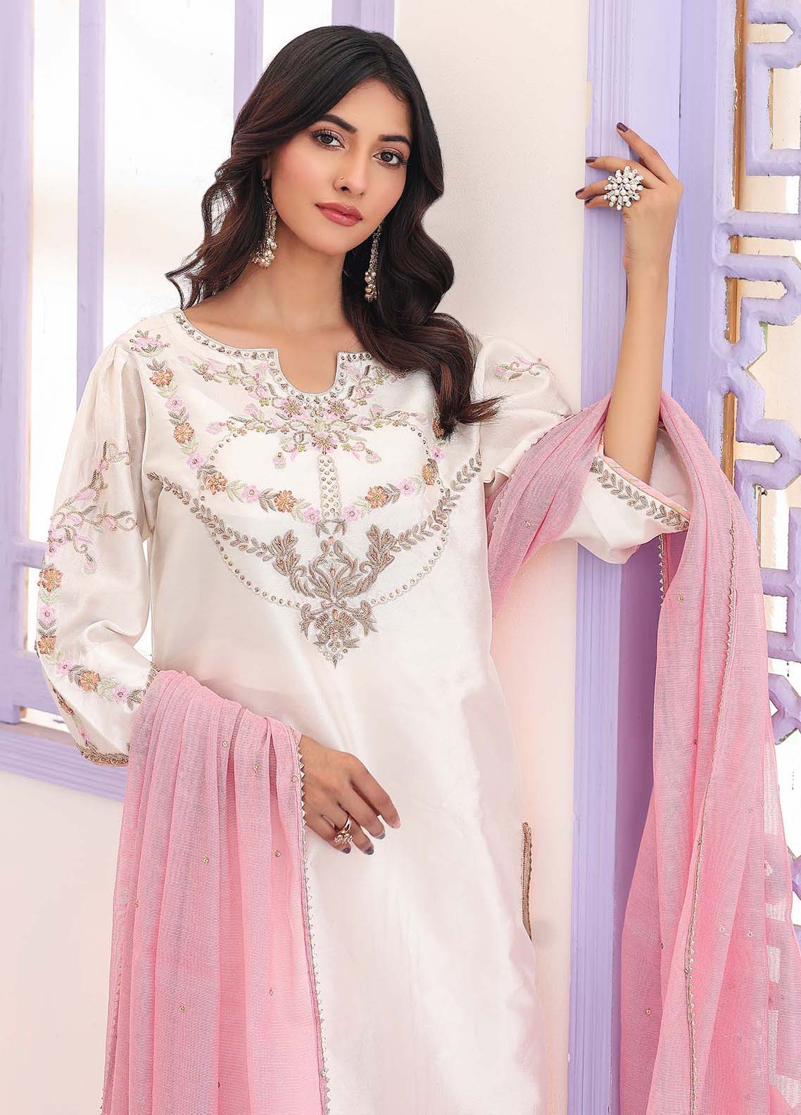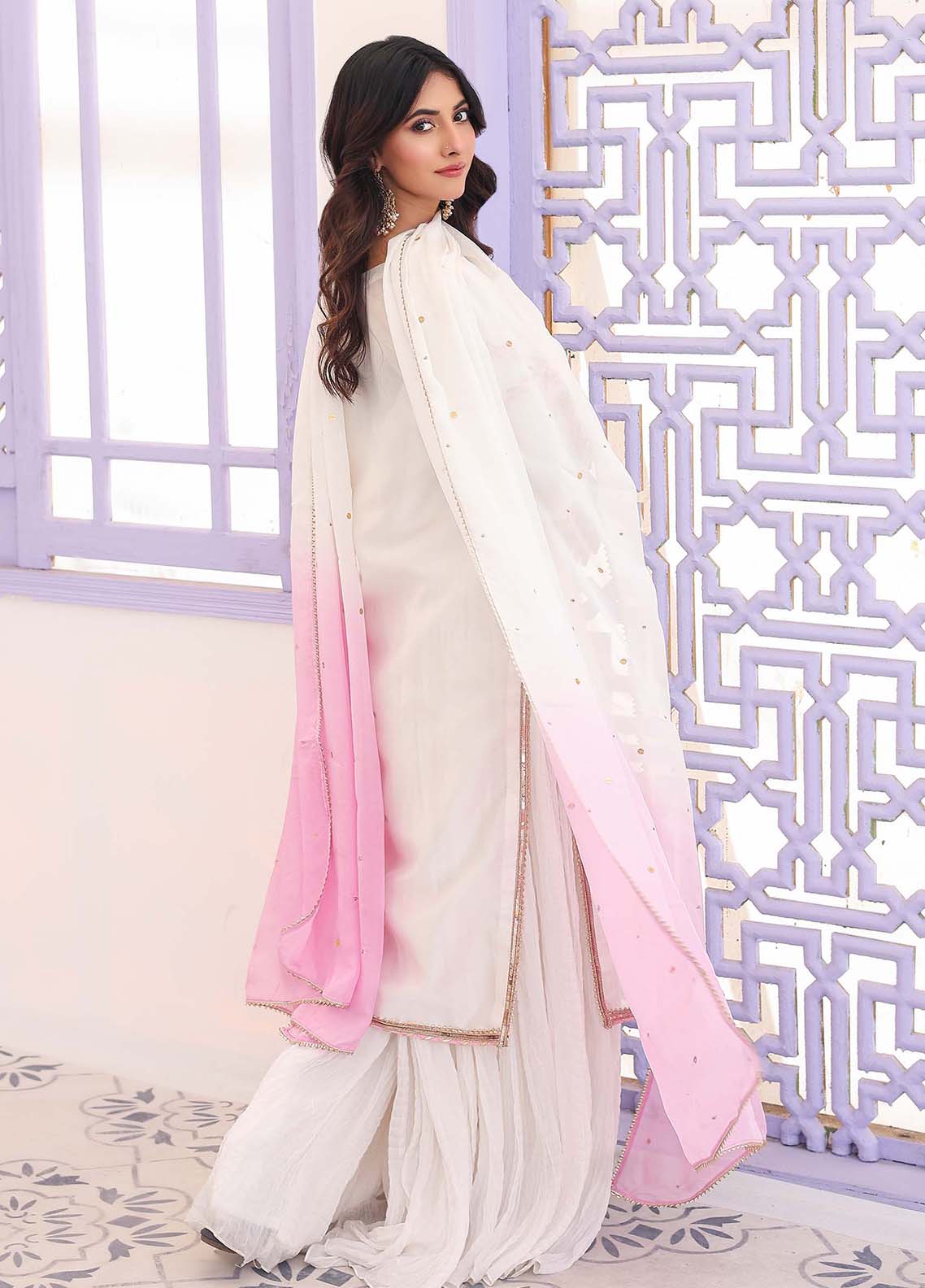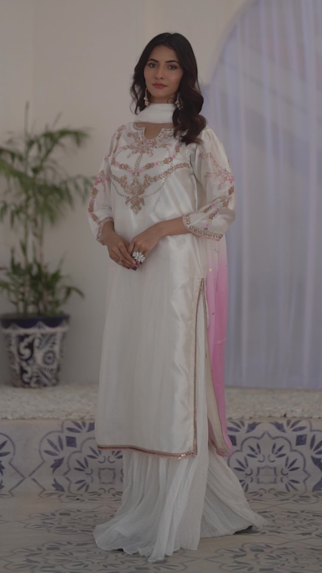 Adaab shows blissing glam in white shade of shisha silk with some embellishments of handwork of dusty gold with classical chic of baby pink and mint green shades...