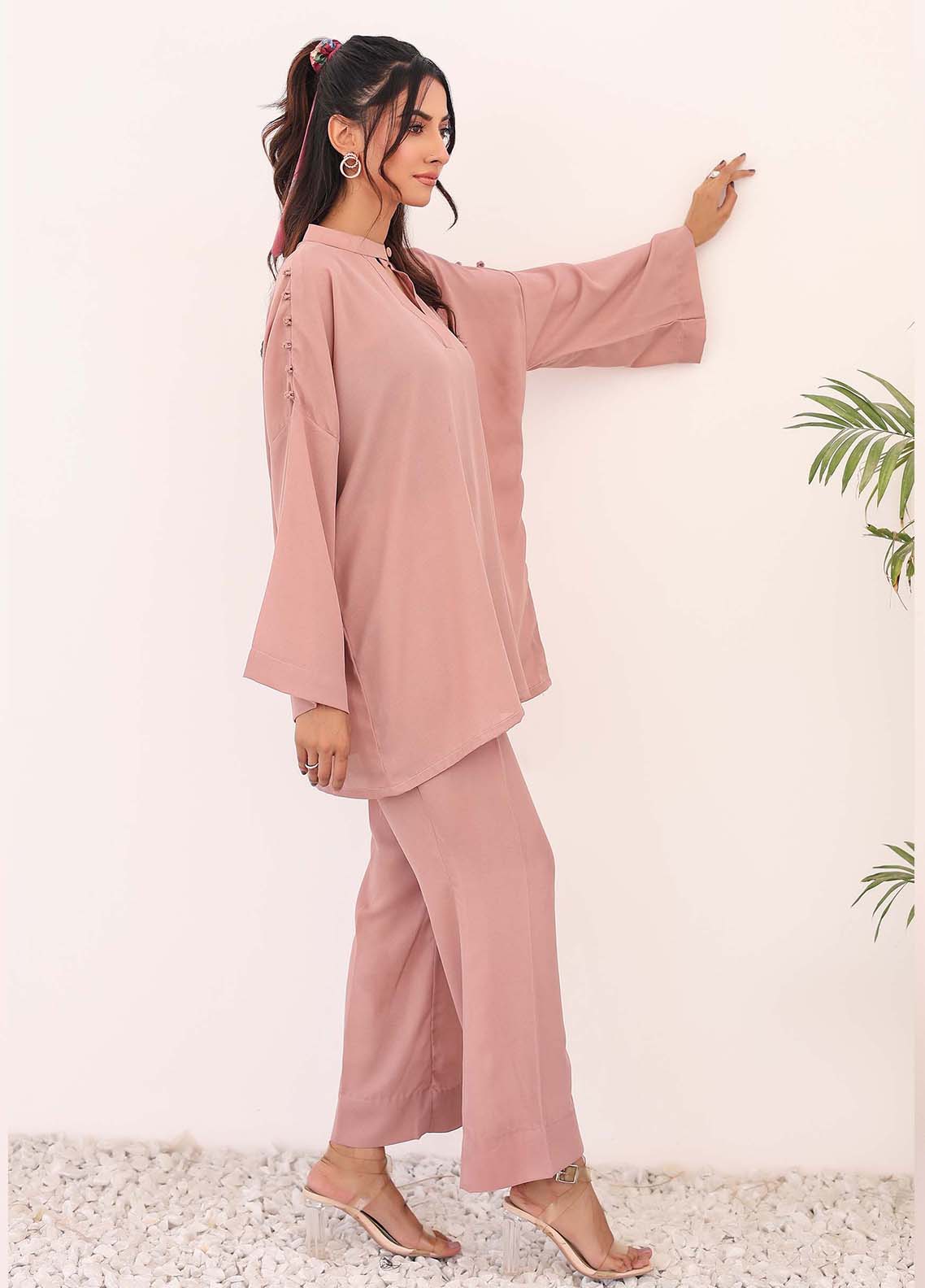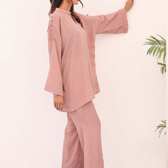 A stylish pink ensemble designed for the modern fashionista, shirt showcase with knotted button and loose sleeves with a buttoned collar and v- shaped neckline with loose shirt gives the perfection of western cuts. Paired with the straight pant and subtle pockets along with it. Dusty Rose is the perfect ease and elegance which making it an essential part of our wardrobe.