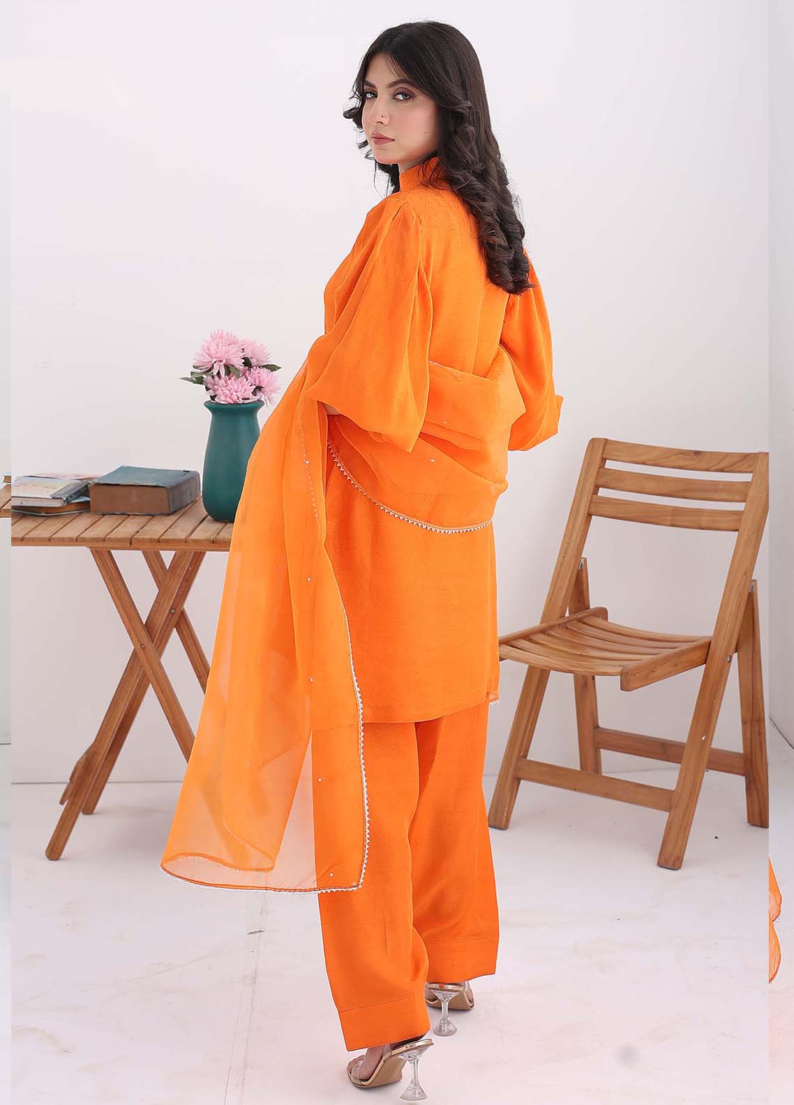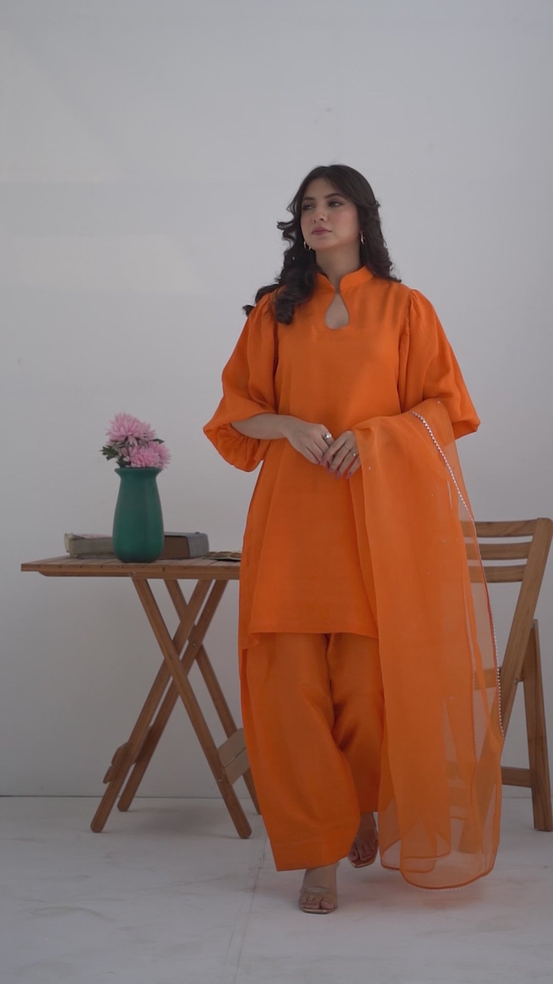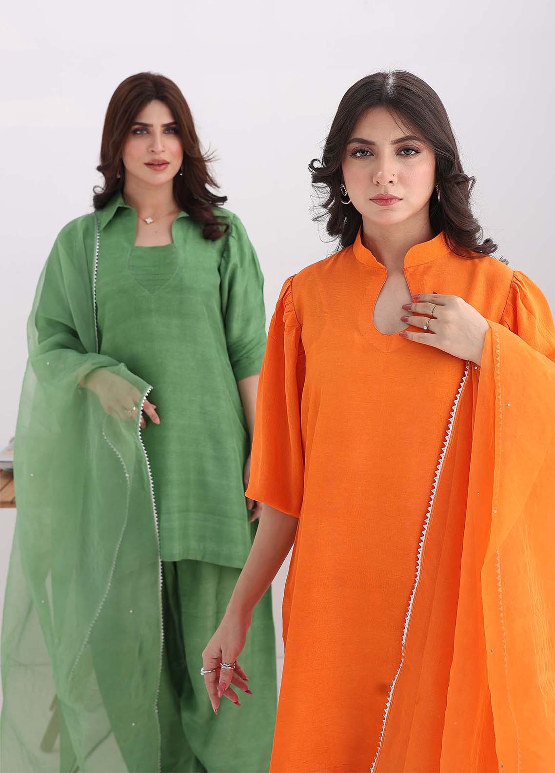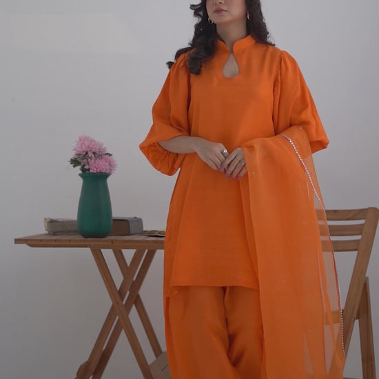Style your elegance in the shade of keenu in short silk with sherwani collar and balloon sleeves. Paired up with traditional shalwar pants.Pure Organza dupatta with minimal chan and silver kingri completes the tradition. Those who loves tradition and style together will love Keenu.