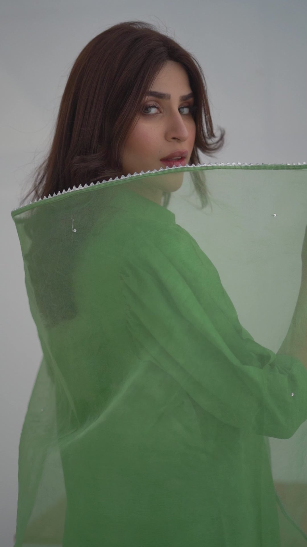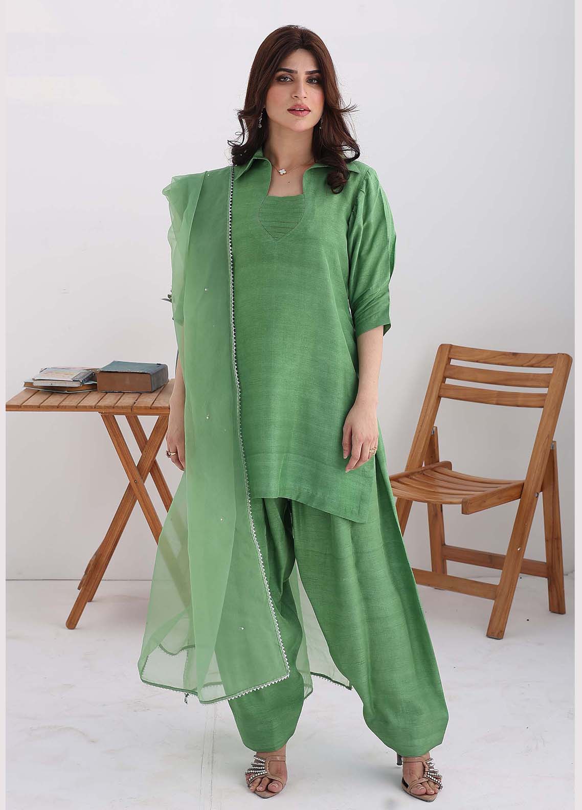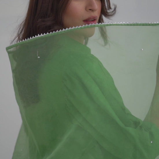 Embrace the ethnic tradition in the shade of kiwi in short silk with collar neck and gathers with pleated sleeves. Paired up with traditional shalwar pants.Pure Organza dupatta with minimal chan and silver kingri completes the tradition. Those who loves tradition and style together will love Kiwi.