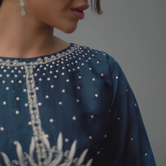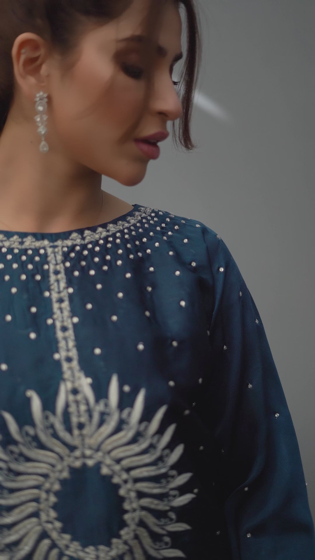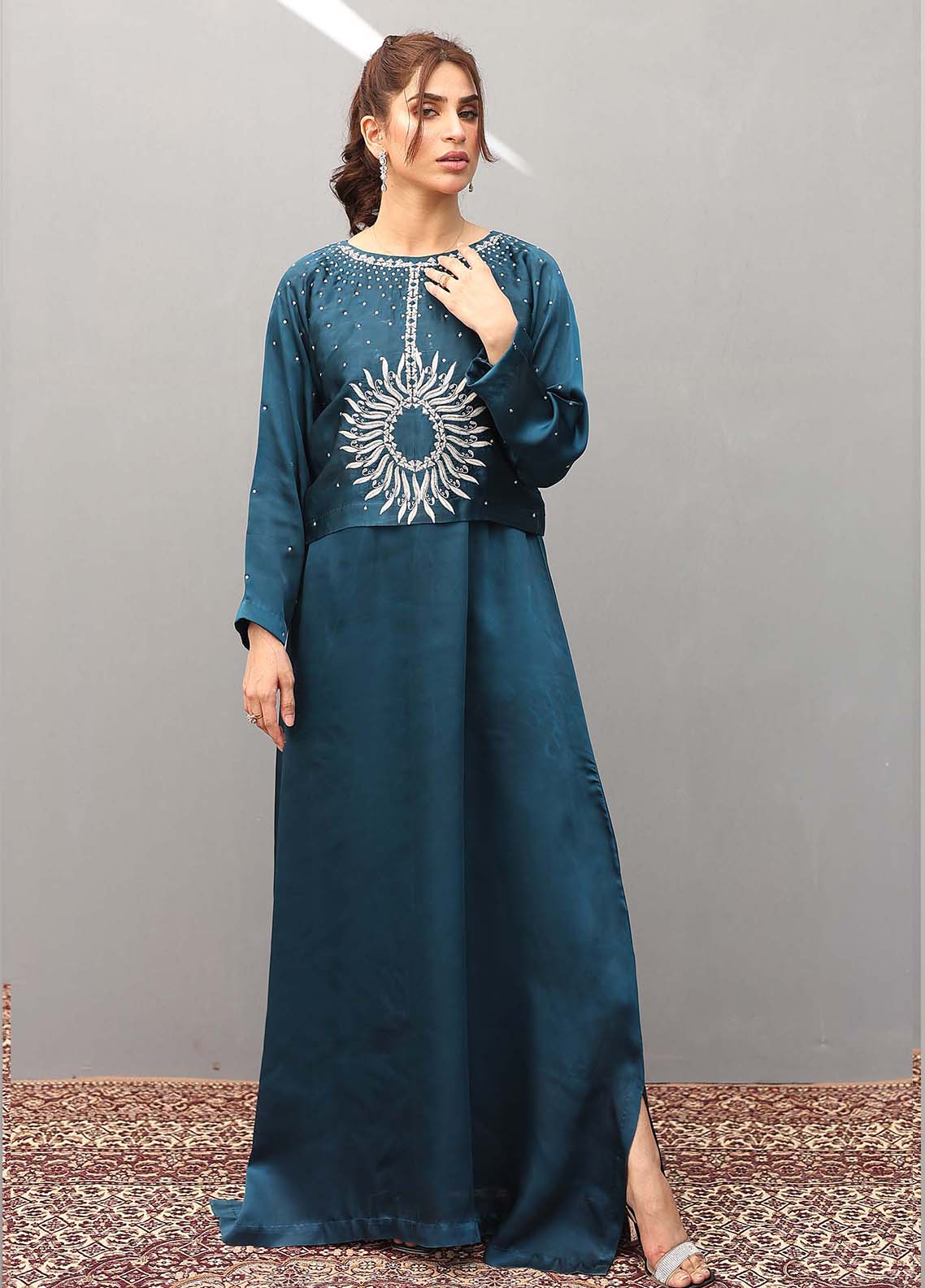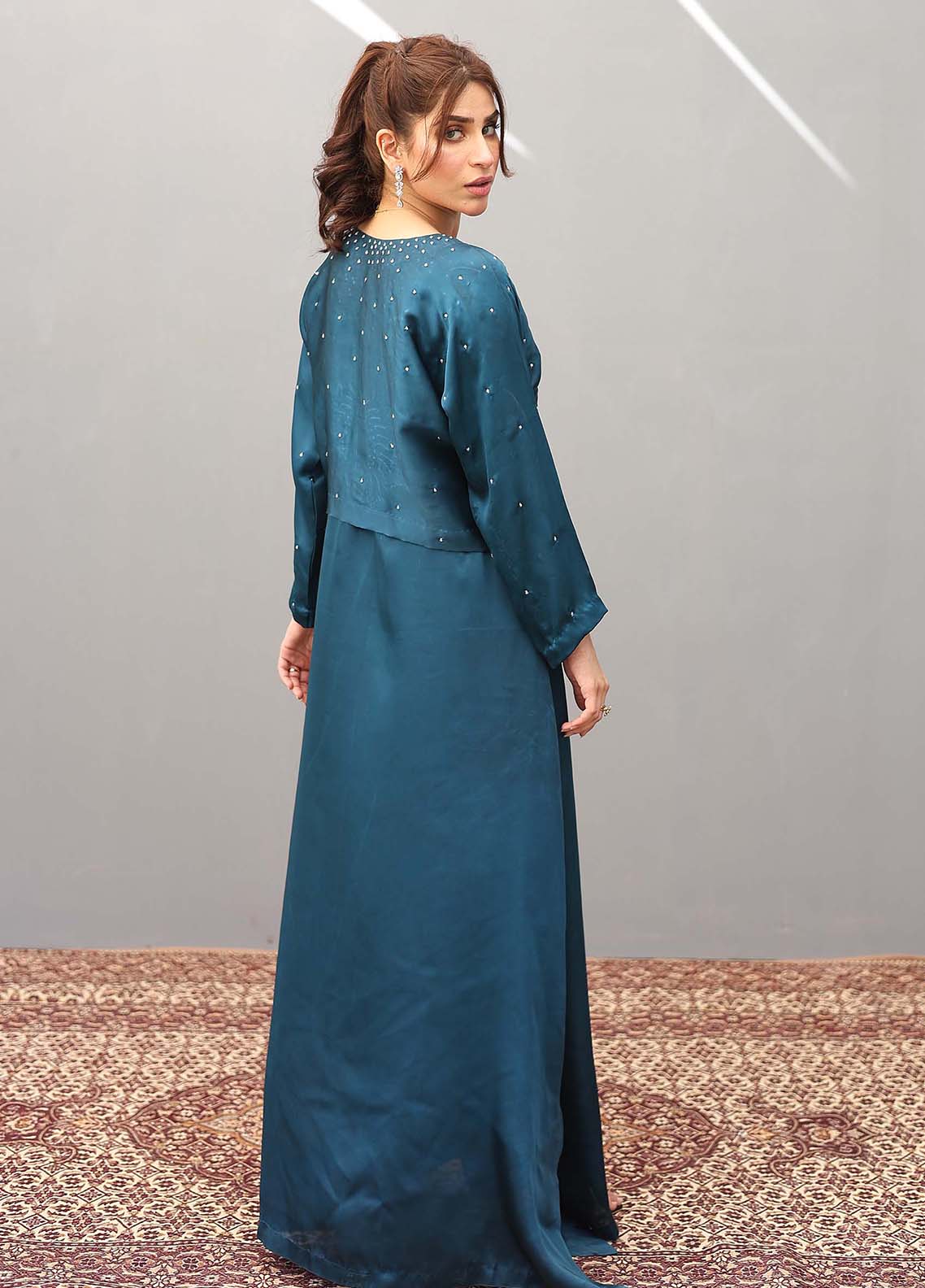 Embrace the elegance in our mint frost kaftan of turquoise shade in silk with a big sunflower in white embellishment of katdana and pure resham on cap of the slip maxy. Full sleeves of cap complete the design of kaftan and slip is without sleeves give stylish glimpse to the Mint Frost.