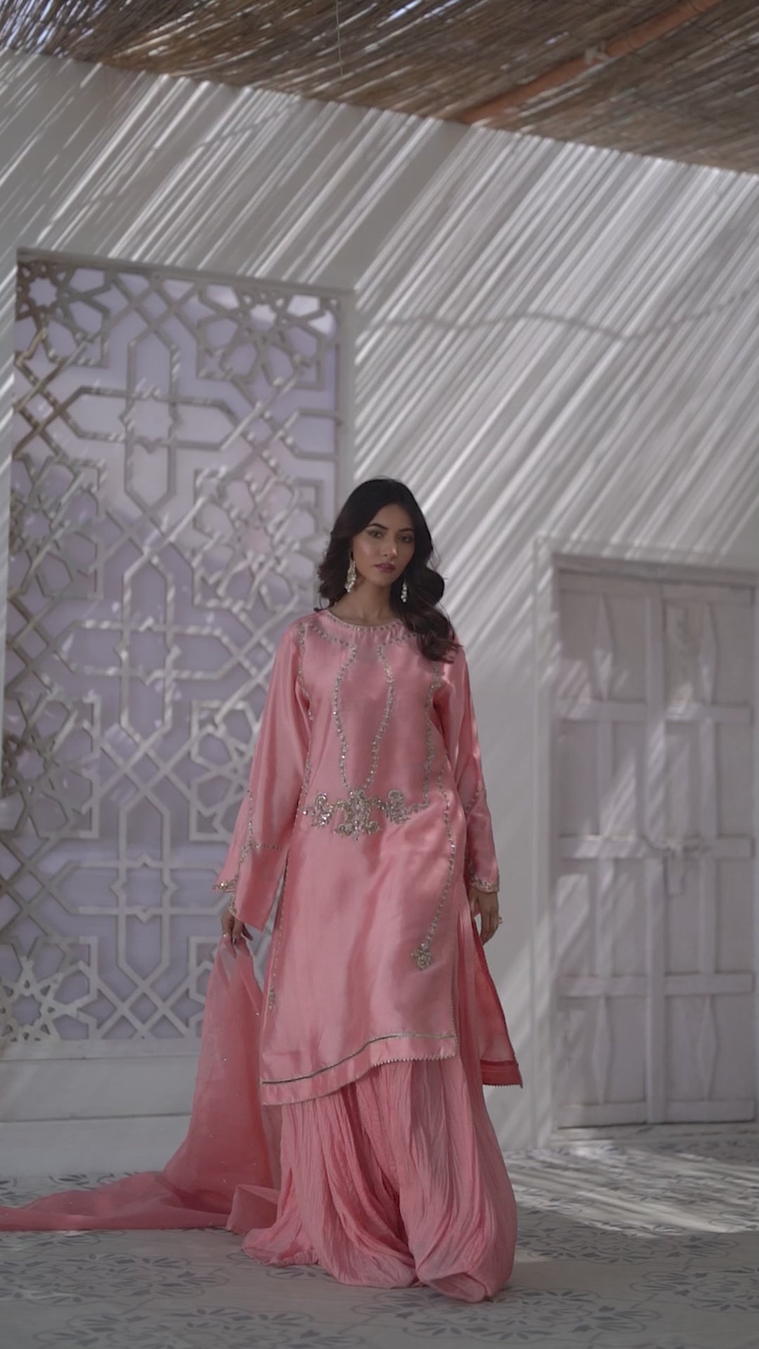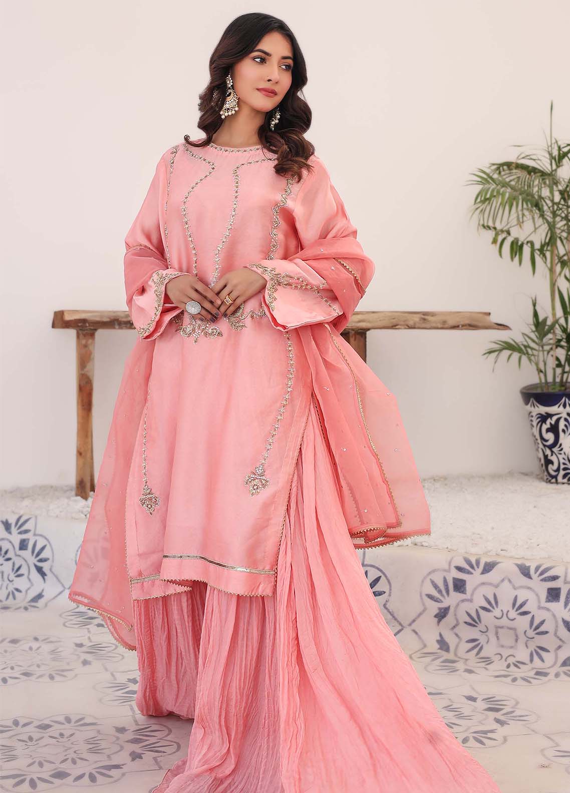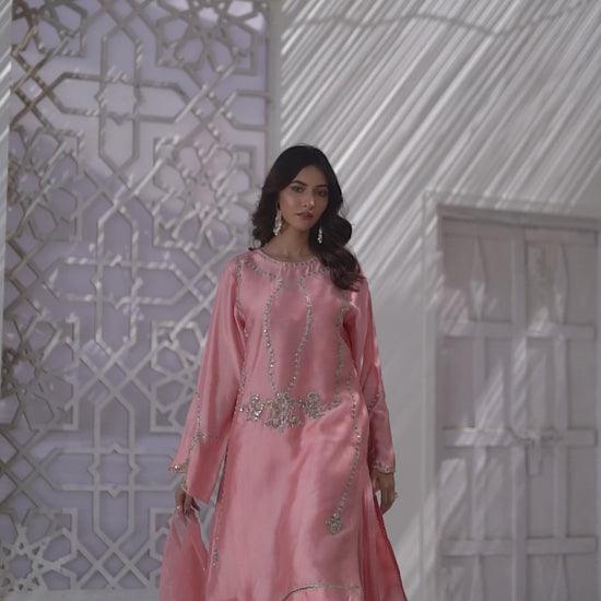 Nazakat brings classical glimpse in pink shade of sheesha silk with handwork of banarsi gold with the touch of antique shade connect with classical resham of lavender and mint green , embalished with sparkling stones. Nazakat gives neat glimpse with premium dhaka of crush in pure pink shade. Pure organza with some stone work with a gold kingri gives classical allure.