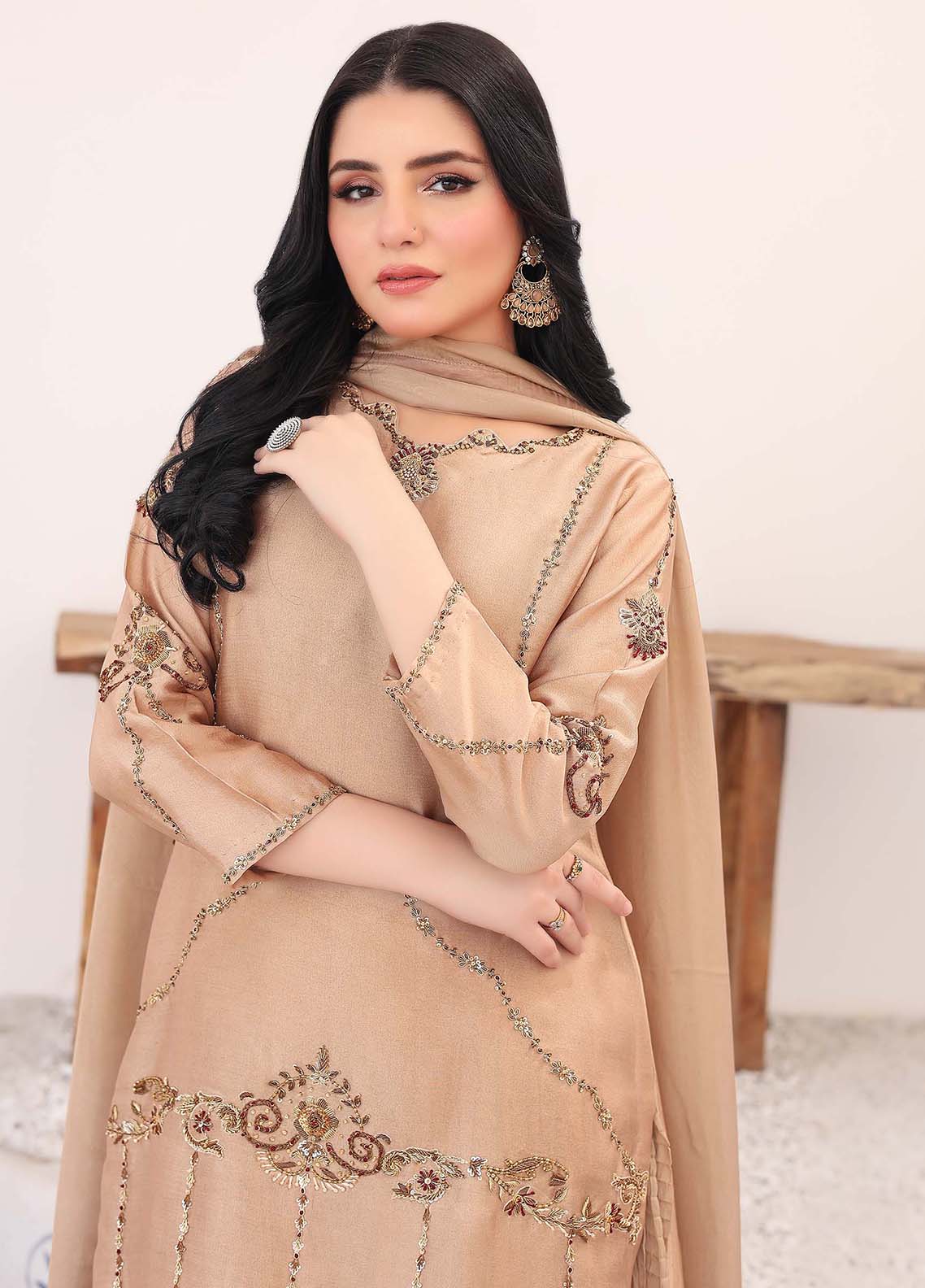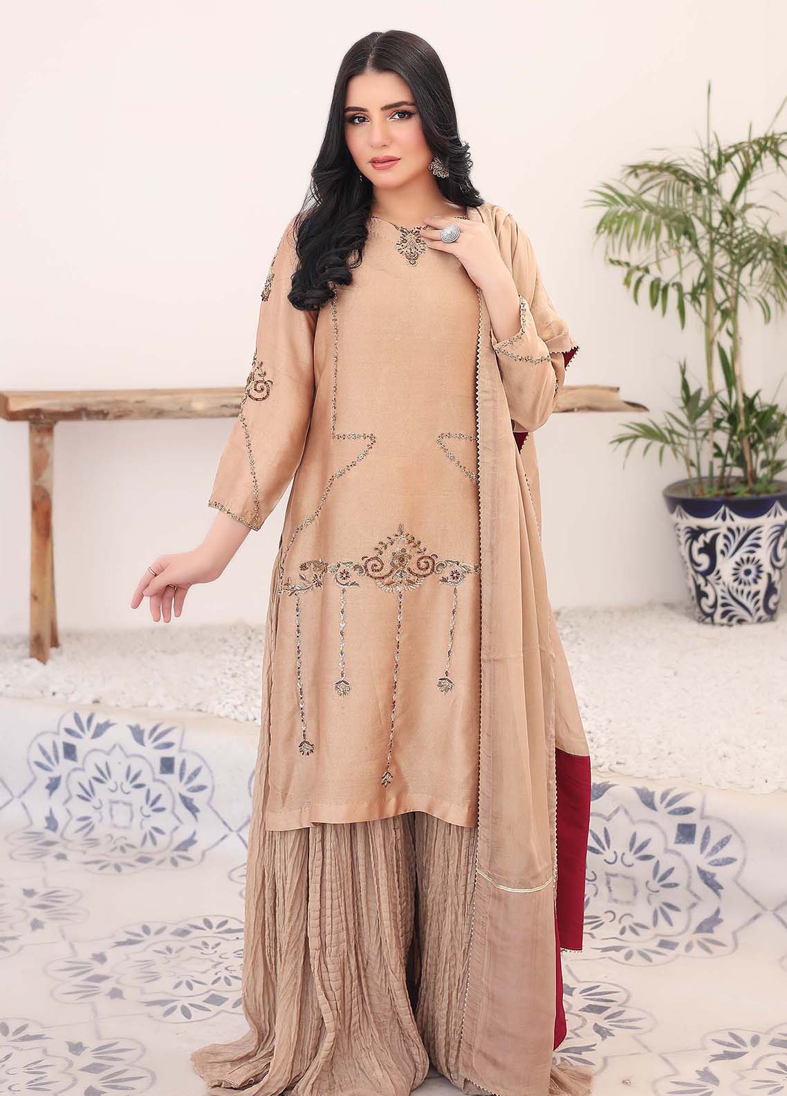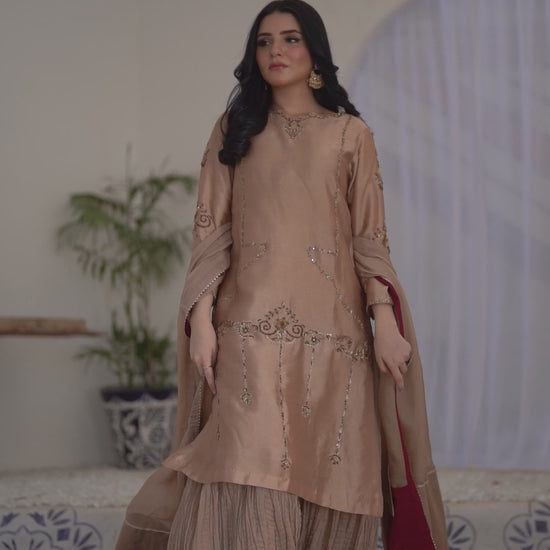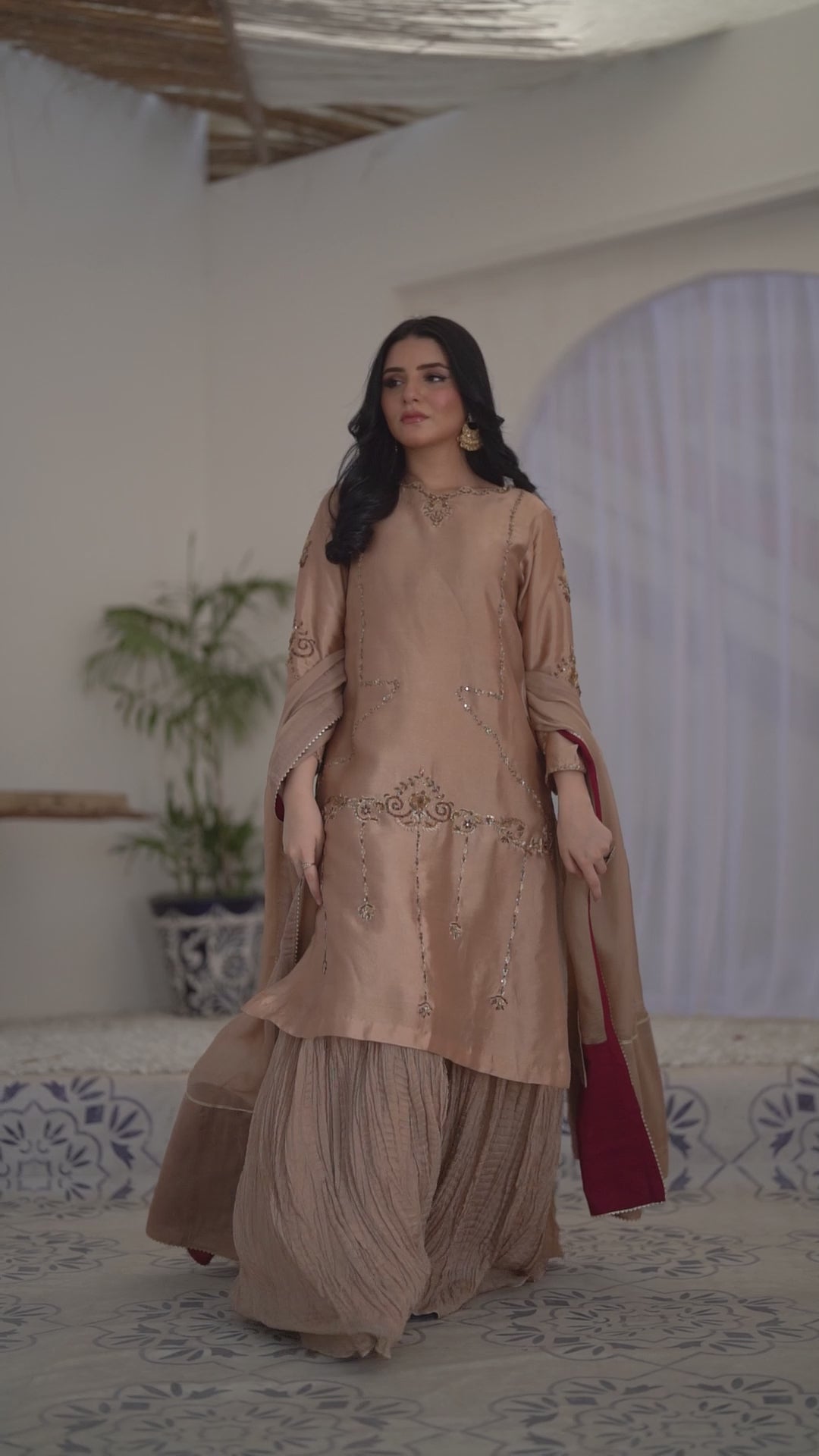 Tehzeeb gives royal glam in elegant beige color with sheesha silk embalished with bliss of banarsi gold with shahi touch of antique and Skin connect sparkling maroon flaming resham. Tehzeeb give’s royal look with luxury Dhaka in premium crush of blissing beige covered with the glaming of medium silk dupatta engaged with flaming of maroon on the borders and some sparkles gives luxury allure.
