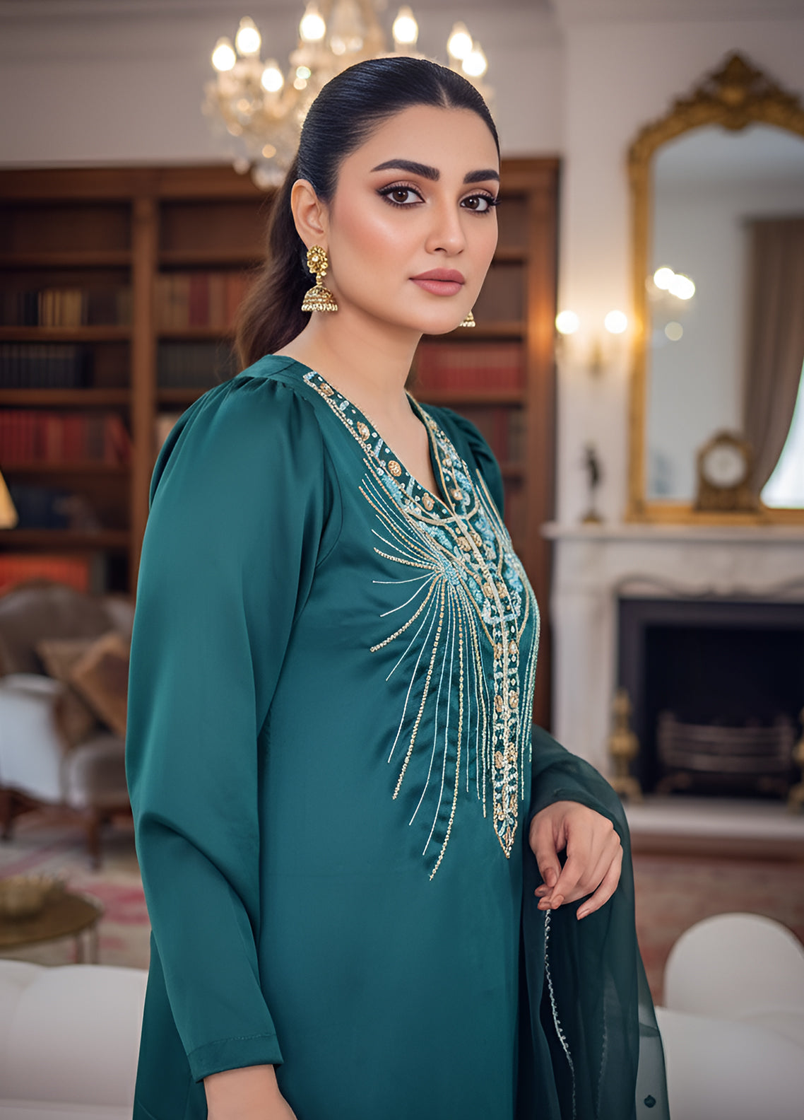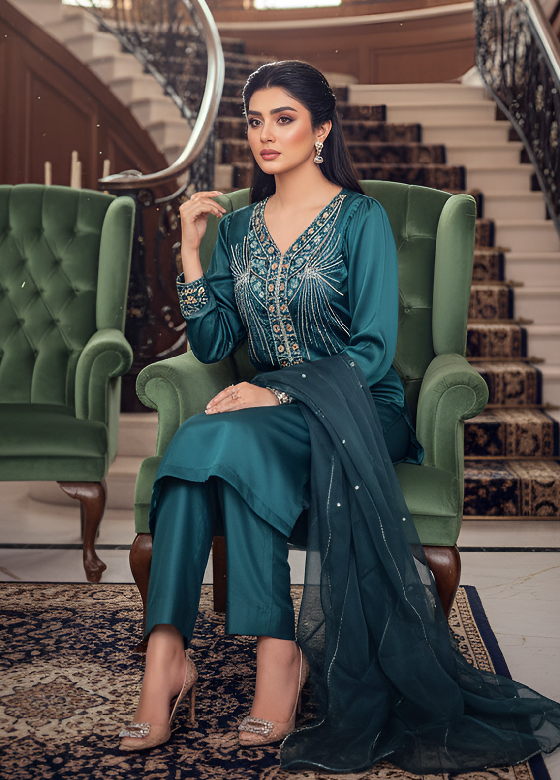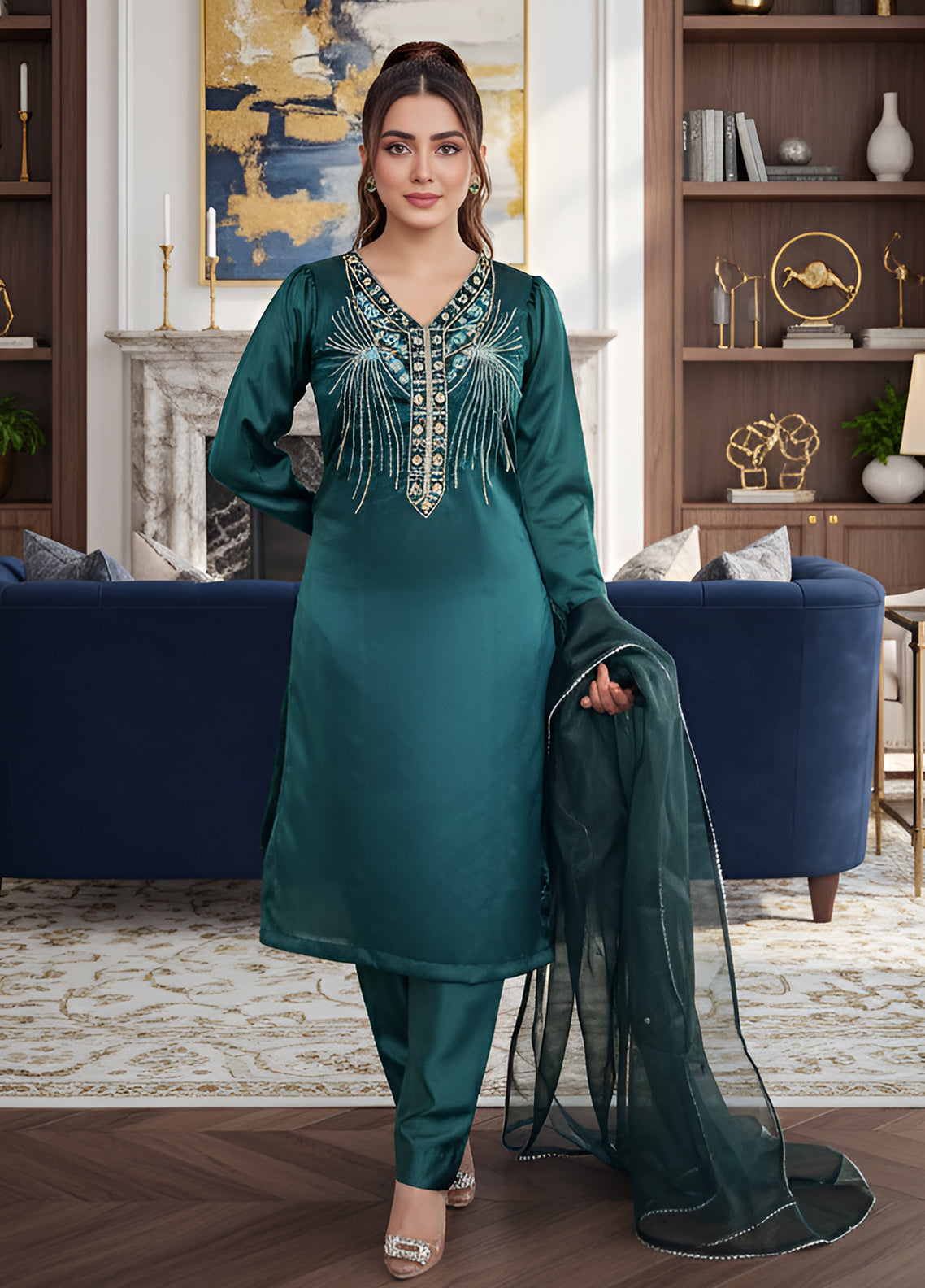 Discover true elegance with our exquisite 'The Onyx Aura' 3-piece suit, meticulously crafted from luxurious Pure Diamond Silk. This stunning ensemble features a beautifully cut kurti paired with comfortable trousers, both fashioned from the finest Diamond Silk for a rich drape and subtle sheen. The highlight is the breathtaking complete hand-work embellishment on the neckline, adding a touch of bespoke artistry and shimmer. Completing this sophisticated look is an ethereal Organza Dupatta adorned with delicate 'chan' work (small scattered motifs), adding an element of sheer grace. • Work: Complete Hand-Work Embellishments (Neckline), 'Chan' Work on Dupatta • Article Includes: 3 Pieces (Kurti, Trousers, and Dupatta) • Special Offer: Limited Time Sale!