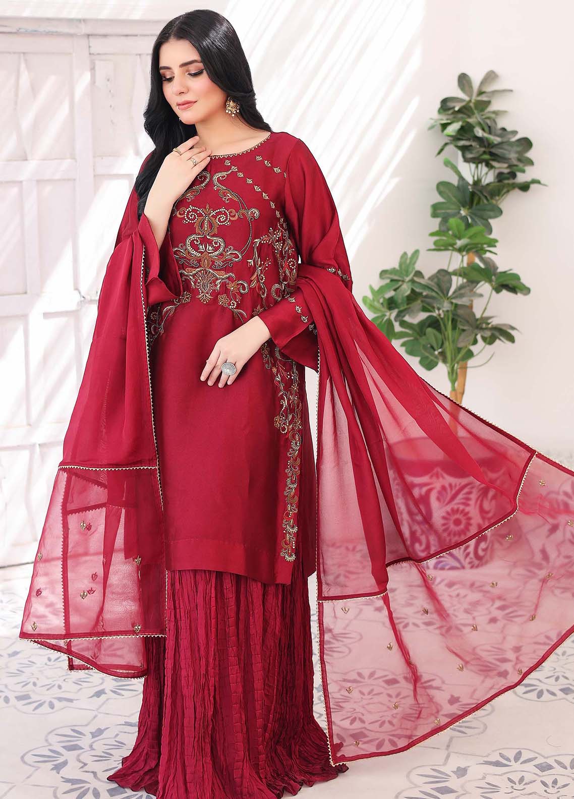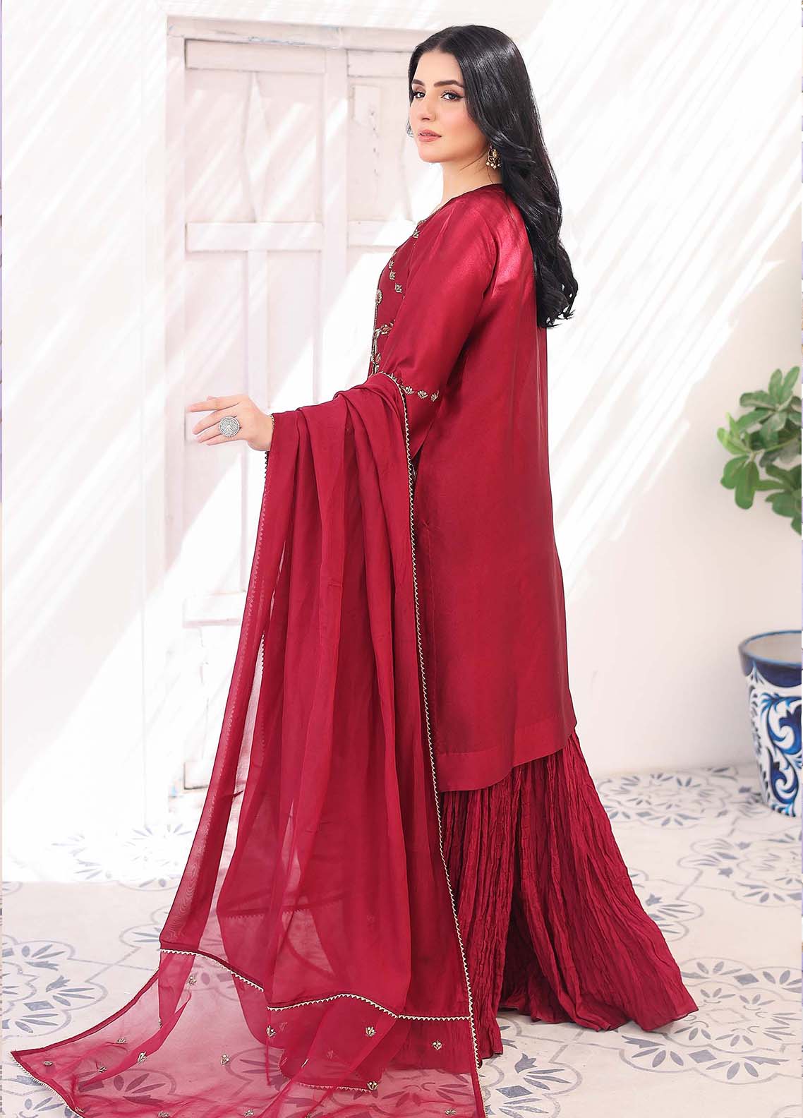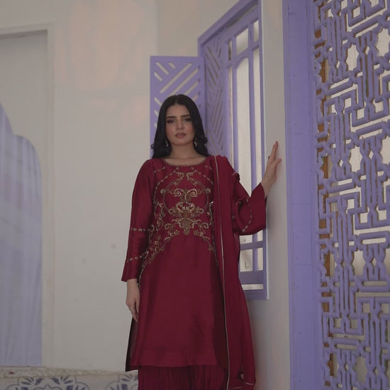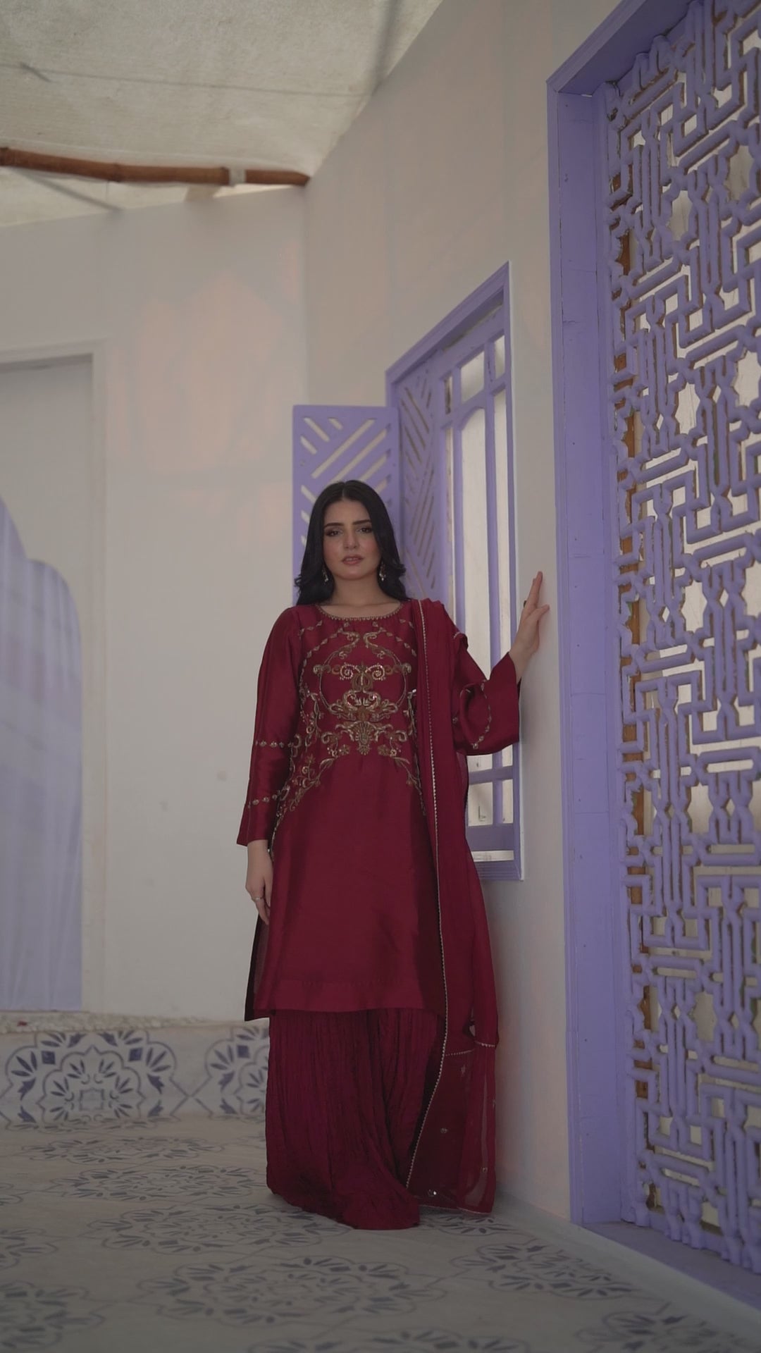 Zarqash gives classical look in premium sheesha silk with the chic of handwork of royal shades of antique. Premium crush dhaka give touches of graceful shade of Maroon . Premium medium silk dupatta with golden kingri gives Zarqash a royal look.