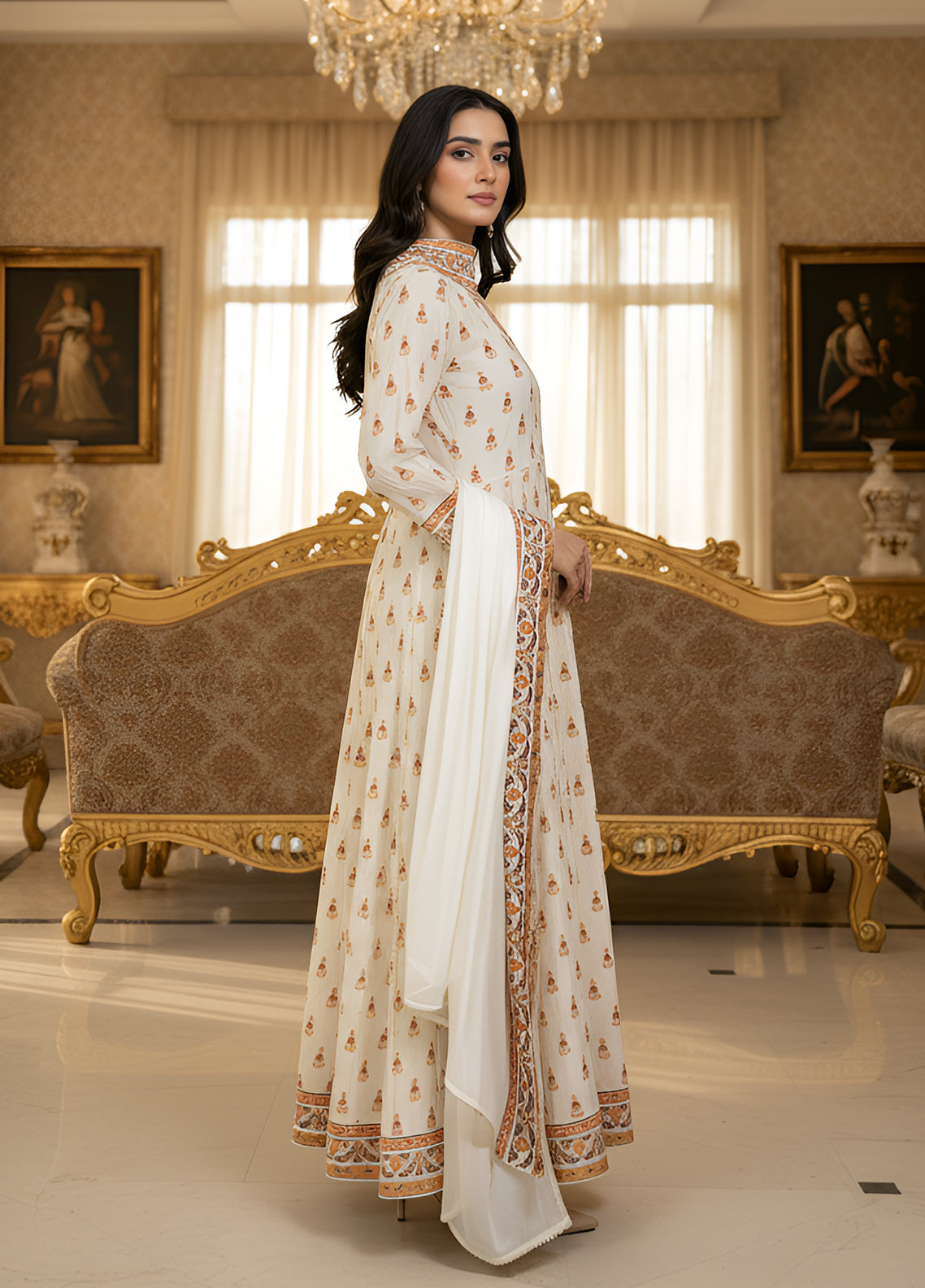 This exquisite ivory-hued, full-length frock exudes grace with its flattering pleated silhouette. The entire ensemble is detailed with subtle teardrop-shaped bootis (small scattered motifs) in burnt orange, contrasted beautifully by rich, intricately embroidered patterns around the high band collar and scalloped cuffs. An attire designed to make a truly majestic statement.